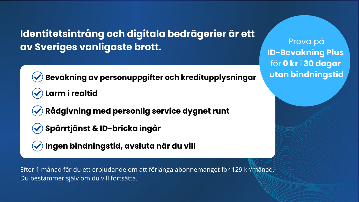 Erbjudandet gäller endast för nya kunder/kunder som inte har ett aktivt abonnemang för ID-Bevakning i dagsläget samt individer som är 18 år eller äldre. Om du inte uppfyller dessa krav kan du inte ta del av erbjudandet.